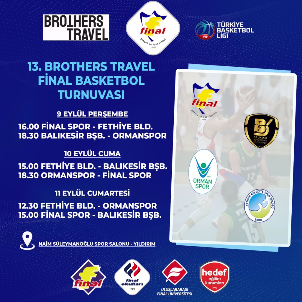 Bu sene 13. düzenlenecek olan Brothers Travel Final Turnuvası 9-11 Eylül tarihlerinde Bursa Naim Süleymanoğlu Spor Salonu'nda yapılacak.