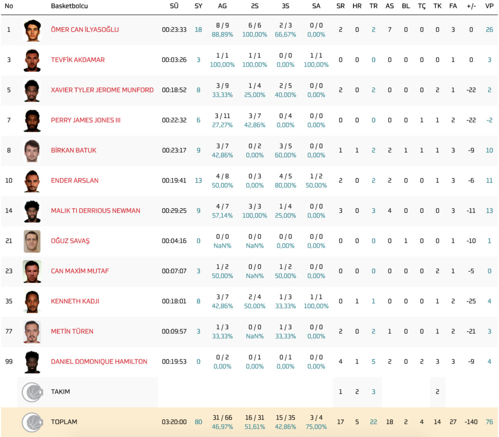 Petkim: Kendrick Ray 21 sayı (4/7 üçlük), 13 asist, 2 ribaund, Ege Arar 22 sayı, 10 ribaund, Thomas Wimbush 27 sayı, 13 ribaund, 2 asist, Ian Hummer 18 sayı, 4 ribaund, 4 asist