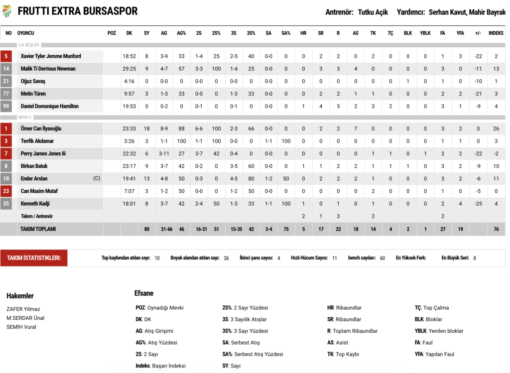 Frutti Extra Bursaspor: Ömer Can İlyasoğlu 18 sayı (2/3 üçlük), 7 asist, 2 ribaund, Ender Arslan 13 sayı (4/5 üçlük), 2 ribaund, 2 asist