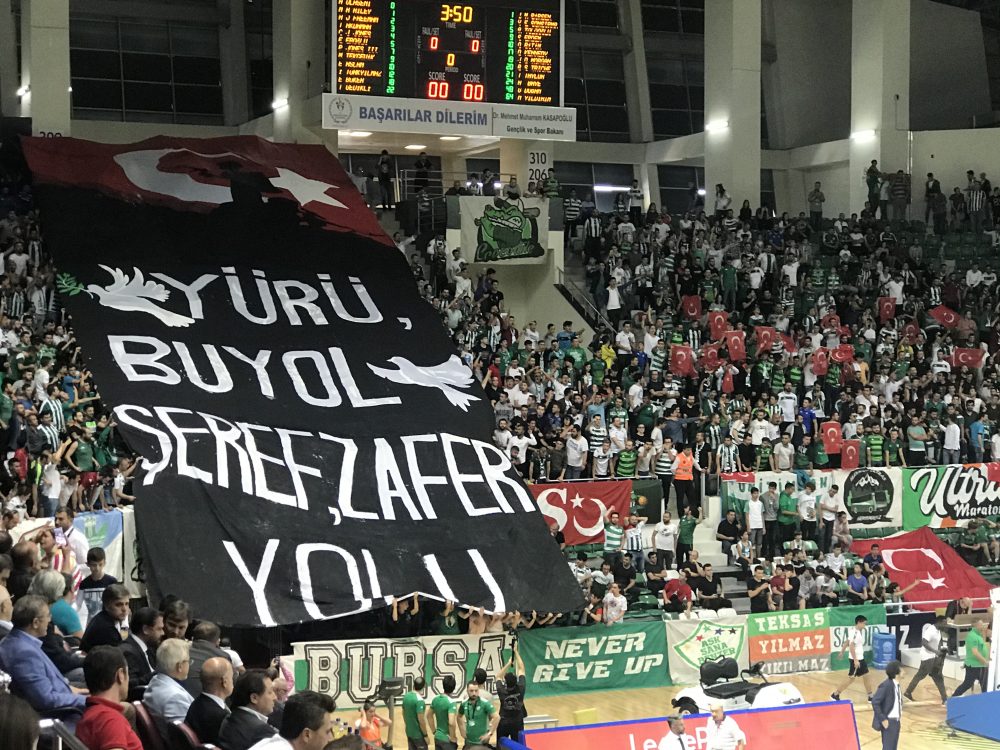 Frutti Ekstra Bursaspor ve Pınar Karşıyaka arasındaki karşılaşma öncesinde taraftarlarımız “Yürü, bu yol şeref, zafer yolu” yazılı pankartı açtı.