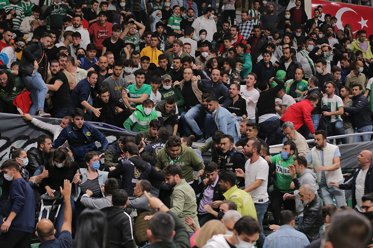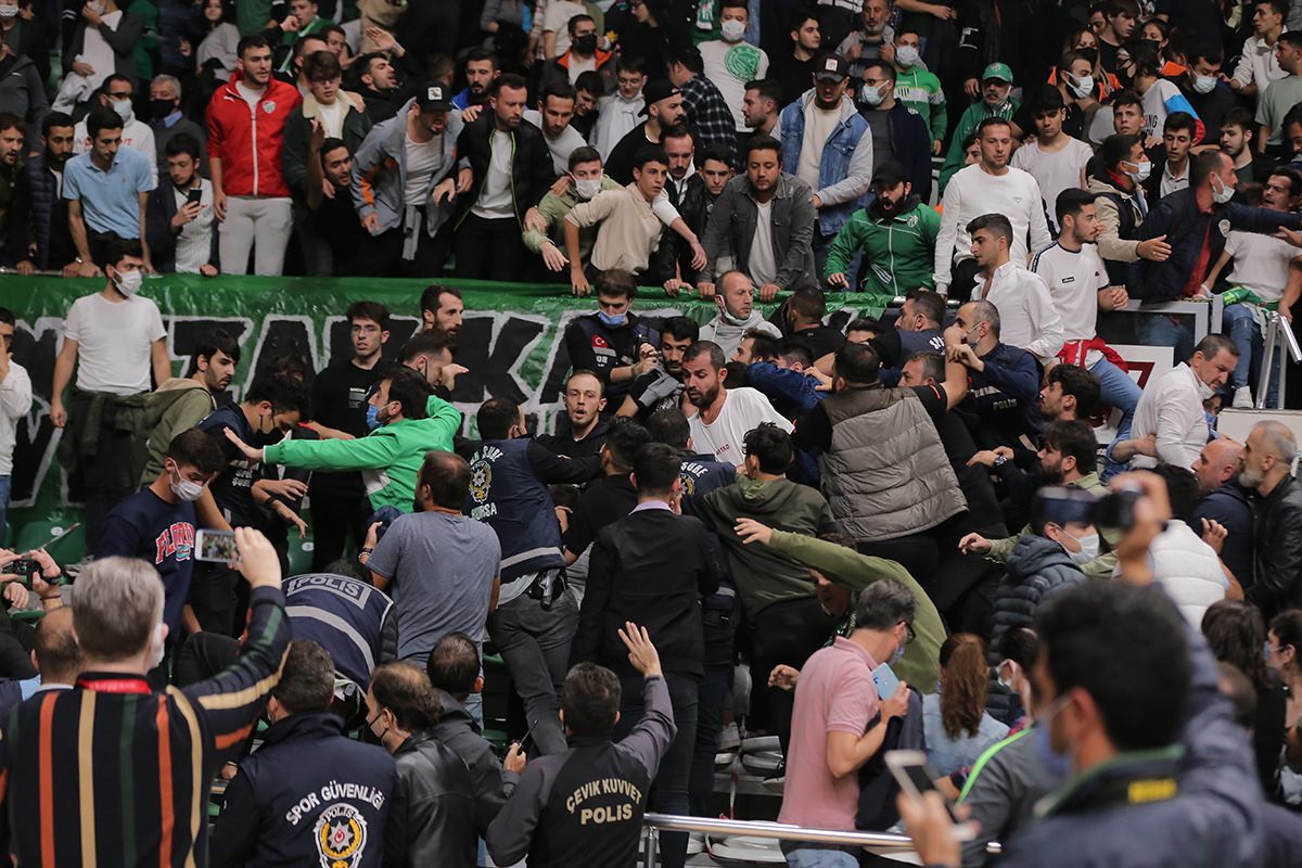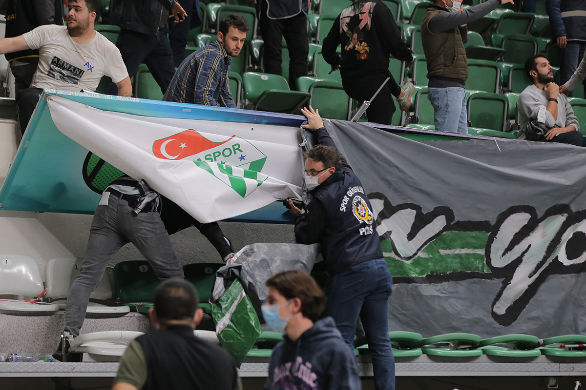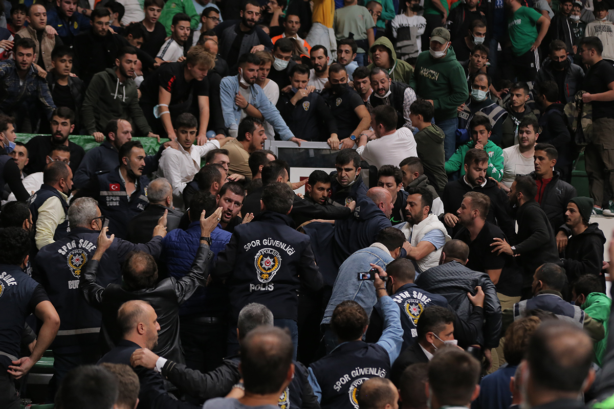 Frutti Extra Bursaspor, ING Basketbol Süper Ligi'nin 3. haftasında Nilüfer Tofaş Spor Salonu'nda Beşiktaş Icrypex'i konuk ederken devre arasında ortalık karıştı.