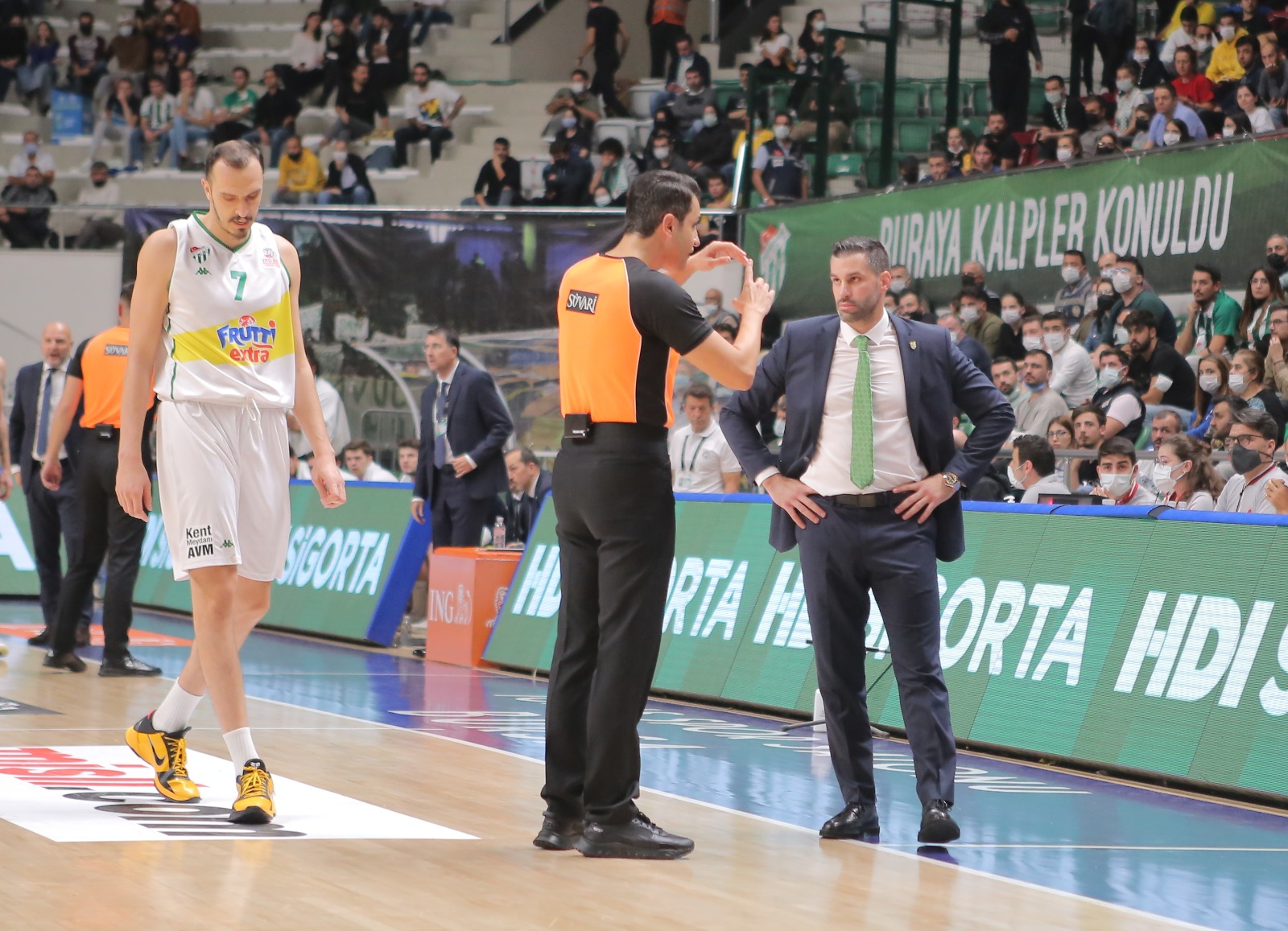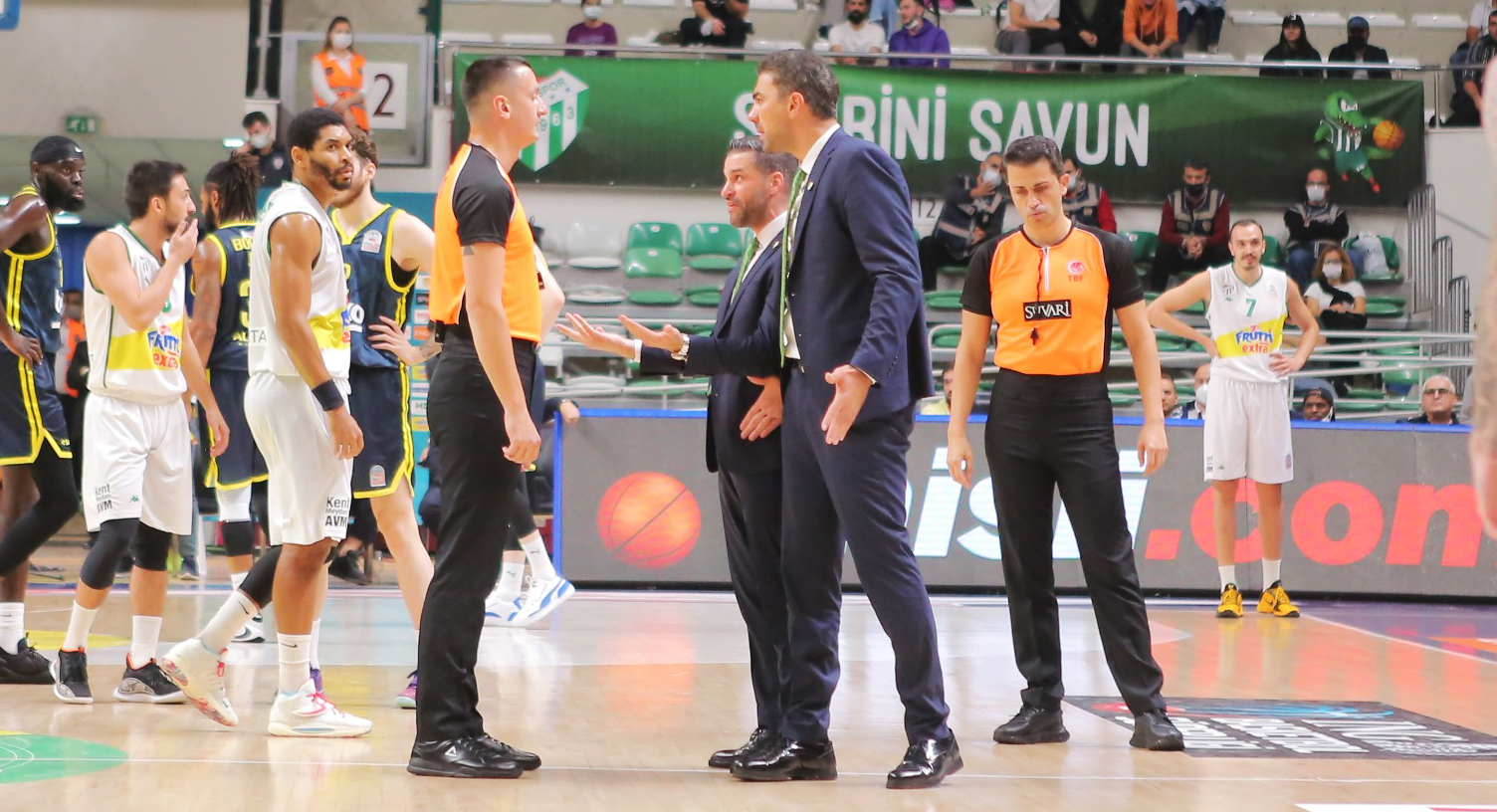 Maçın ilk çeyreğinin bitimine 57 saniye kala yeşil-beyazlı takım aleyhine çalınan tartışmalı faul kararına itiraz eden Bursaspor Başantrenörü Dusan Alimpijevic ile Genel Menajer Nedim Yücel diskalifiye edildi.