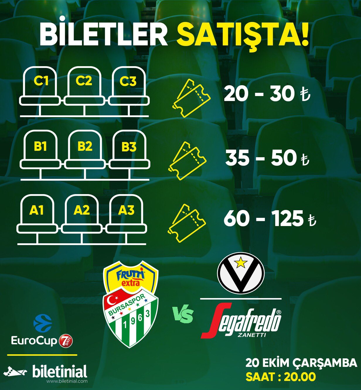 Frutti Extra Bursaspor‘un 20 Ekim Çarşamba saat 20.00‘de oynayacağı Euro Cup‘taki ilk maç olan Virtus Bologna karşılaşmasının biletleri satışta.