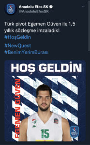 Anasayfa/Bursaspor İnfo Yatırım/Egemen Güven, Anadolu Efes’te Bursaspor İnfo Yatırım Egemen Güven, Anadolu Efes’te Anadolu Efes, Frutti Extra Bursaspor’dan Egemen Güven ile 1,5 yıllık sözleşme imzaladığını duyurdu. Bursa Basket 7 Ocak 2022