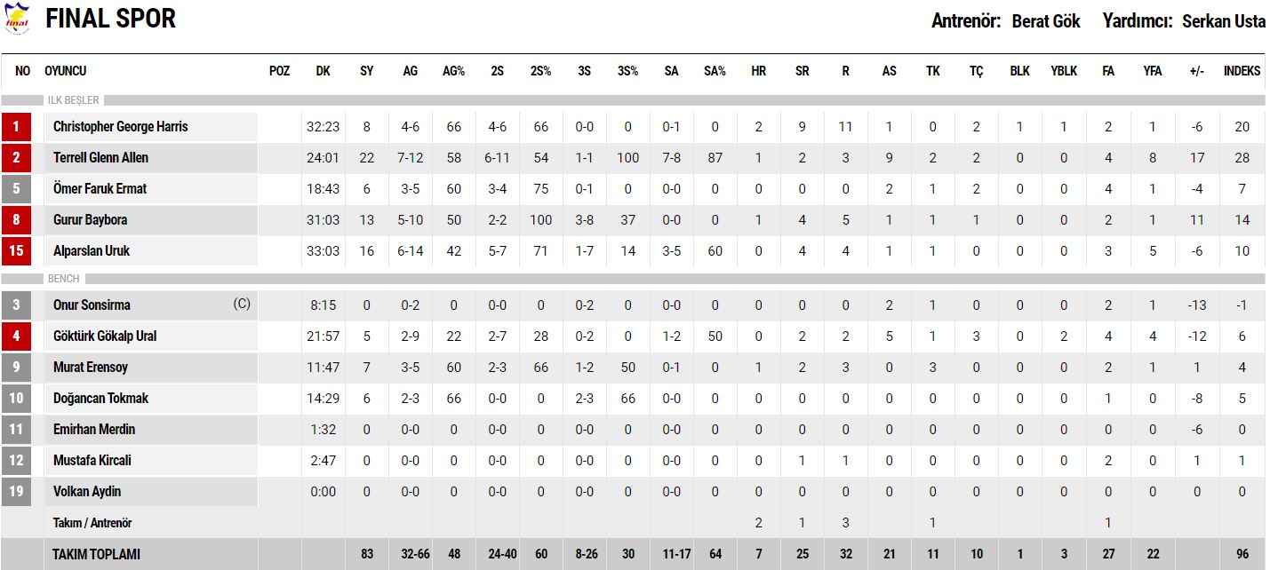 Maçta ilk sayıyı Gurur Baybora‘nın turnikesi ile bulan Final Spor ilk çeyreği 19-23 önde kapattı.
