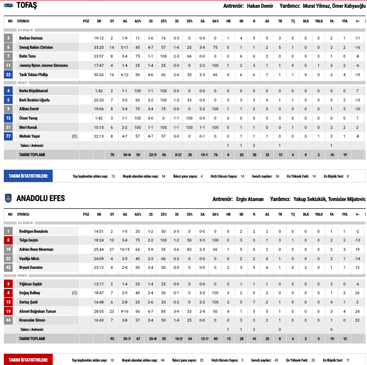 Anadolu Efes karşısında TOFAŞ’ta Tarik Phillip 16 sayı-6 ribaund-7 asist; Semaj Christon 14 sayı-1 ribaund-2 asist ile oynadı.