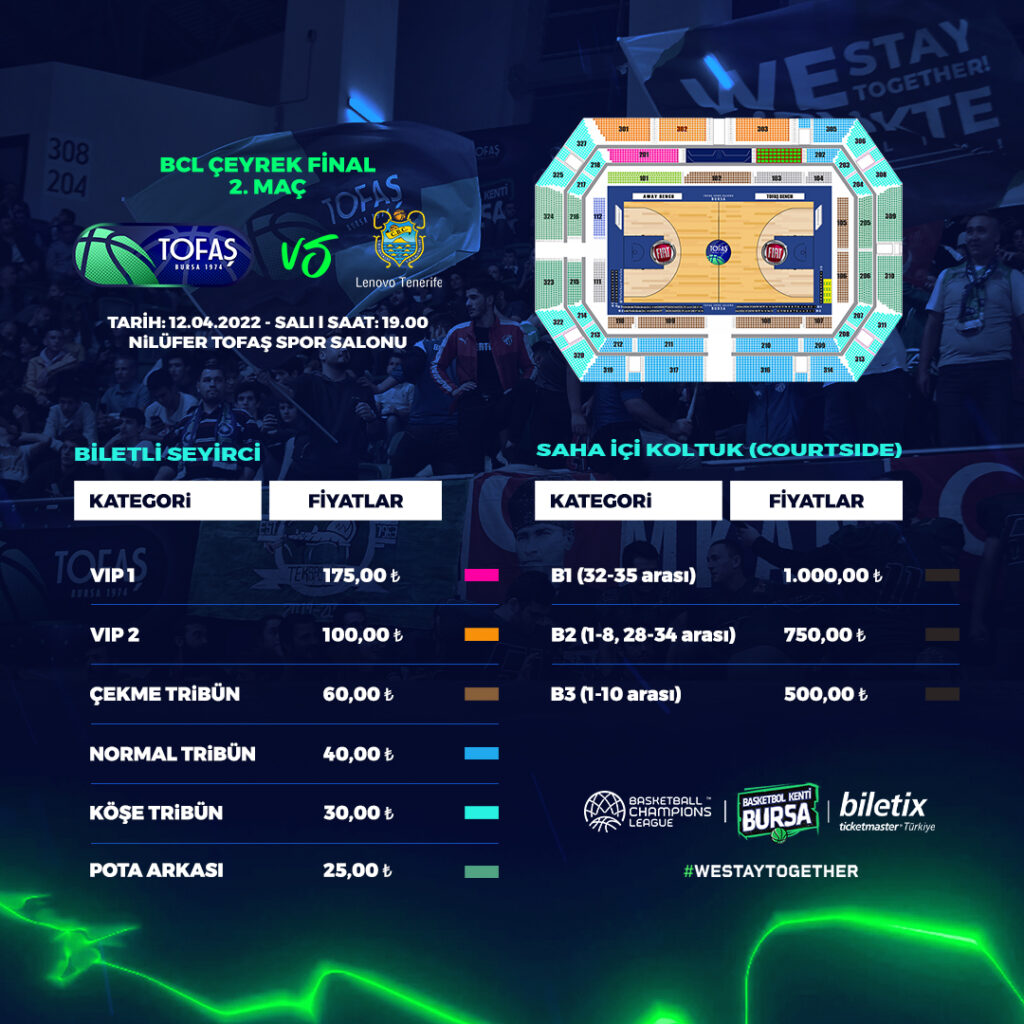 TOFAŞ-Lenovo Tenerive BCL Çeyrek Final Serisi 2. Maçı bilet fiyatları şu şekilde;